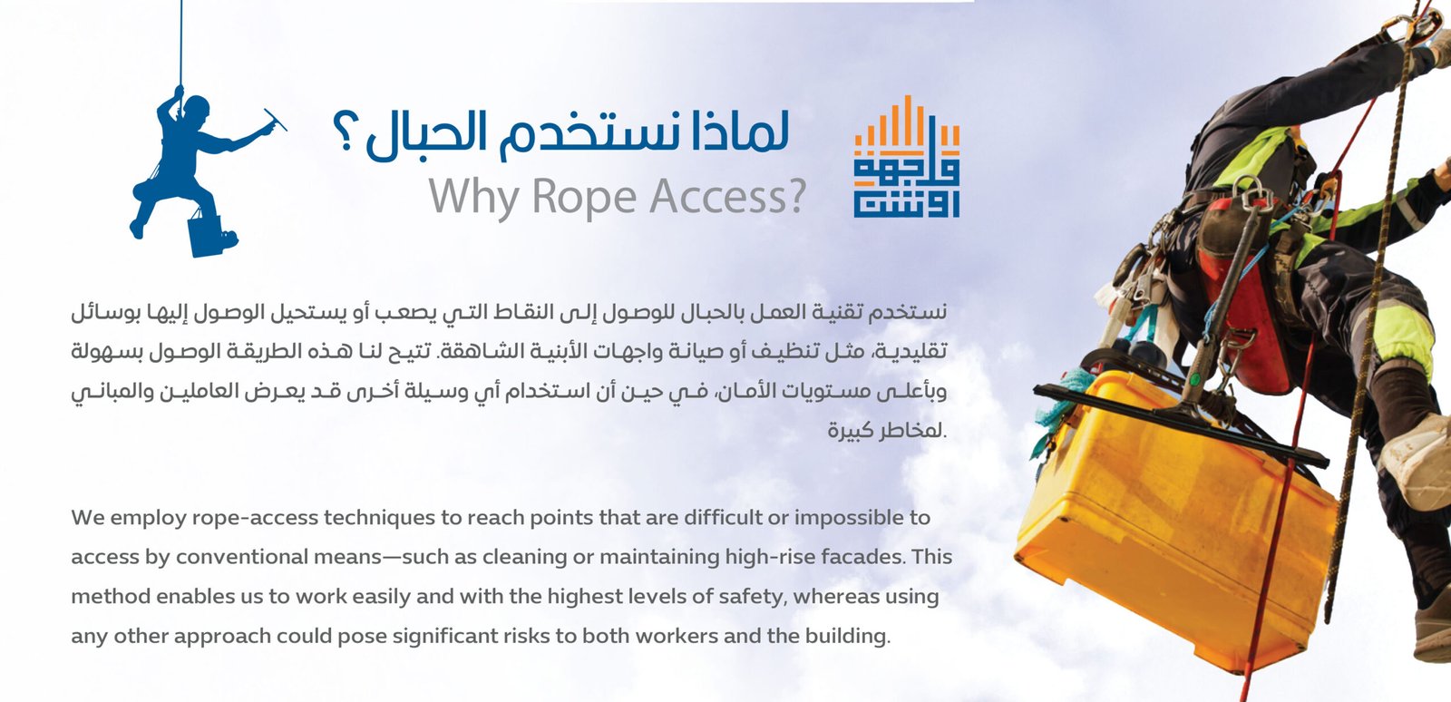 Wajihat Roshan is a Saudi company headquartered in Riyadh, founded in 2003. Since its inception, it has been dedicated to providing comprehensive solutions in general cleaning, glass façade and exterior cladding cleaning for towers, as well as interior and exterior maintenance. We cover all cities across the Kingdom of Saudi Arabia and execute our projects according to agreed schedules and the specific requirements of each site. Our workforce is trained in the latest techniques and methods, holds international certifications from IRATA, and possesses extensive experience and in-depth knowledge of this sector.